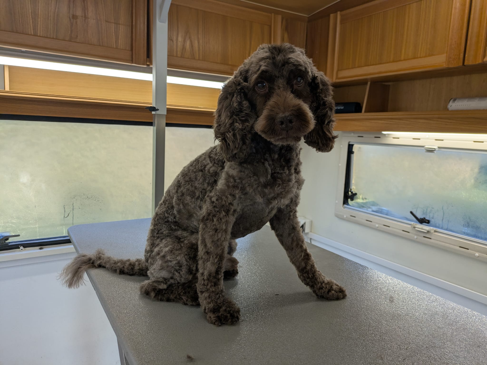 Cockapoo Archie erhielt in Ronny's Pflegehütte eine komplette Pflege. Da sein Fell teilweise stark verfilzt war, wurde es entsprechend kurz geschoren und geschnitten – für ein gepflegtes und angenehmes Fellgefühl.