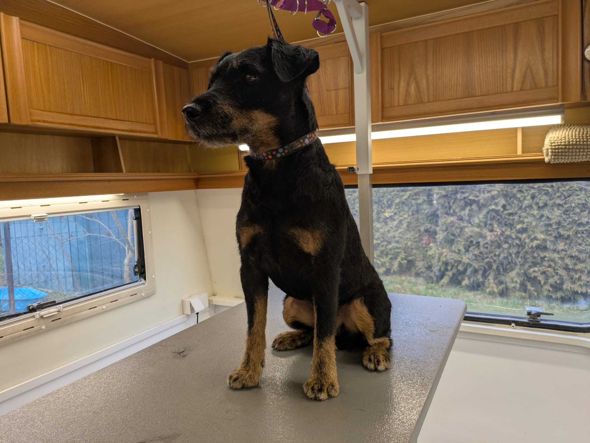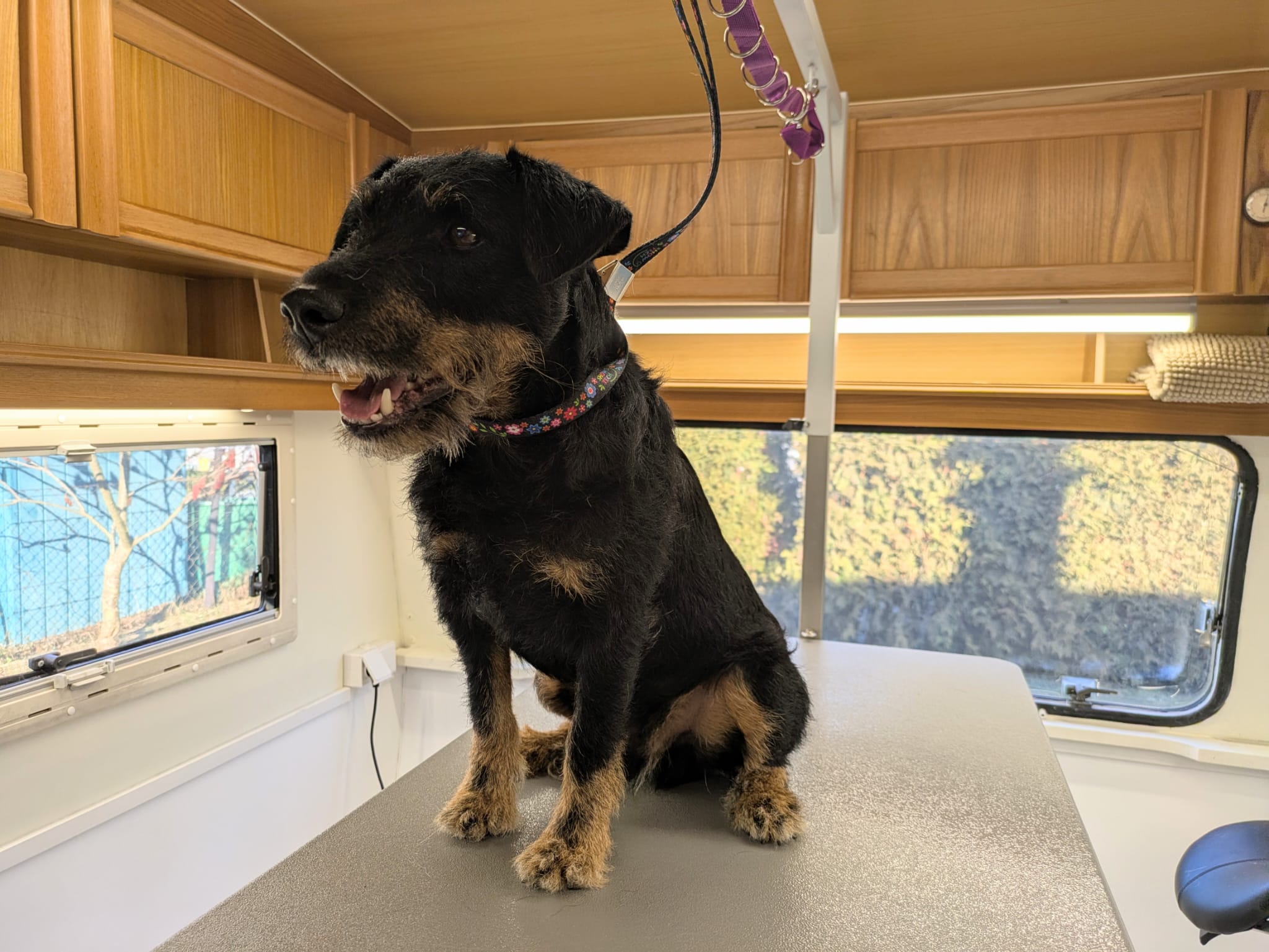 Astor erhielt in Ronny's Pflegehütte eine komplette Trimmbehandlung. Sein temperamentvoller Charakter erforderte viel Geduld und das richtige Feingefühl – aber alles machbar! Zusätzlich gab es Schneiden, Ohren- und Krallenpflege, jedoch kein Bad, da er es nicht mag.
