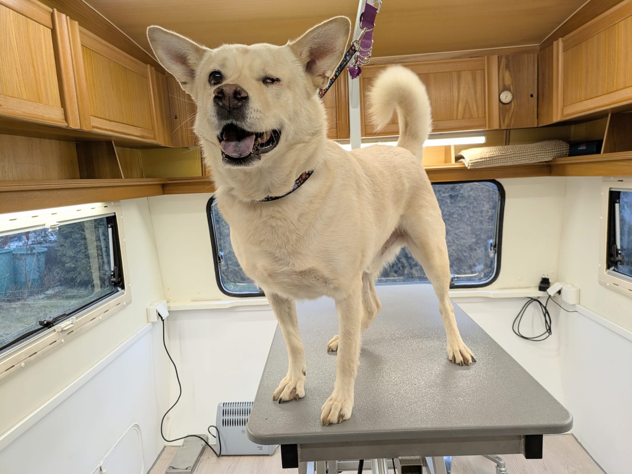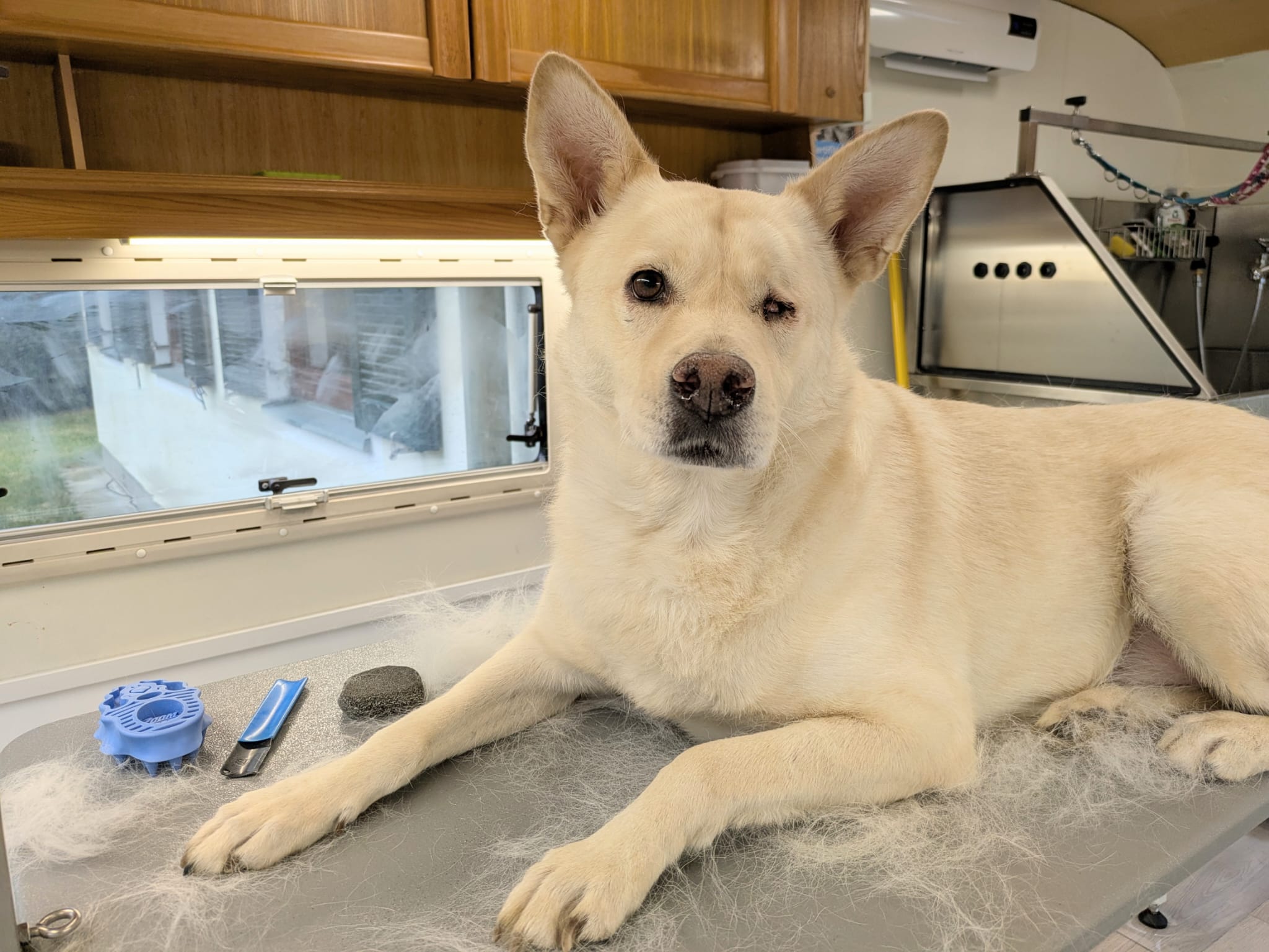 Mischling Leo erhielt in Ronny's Pflegehütte eine komplette Pflege: Waschen, Schneiden, Ohren- und Krallenpflege. Dabei kam eine beeindruckende Menge an losem Fell zum Vorschein – ein echtes Vorher-Nachher-Erlebnis!