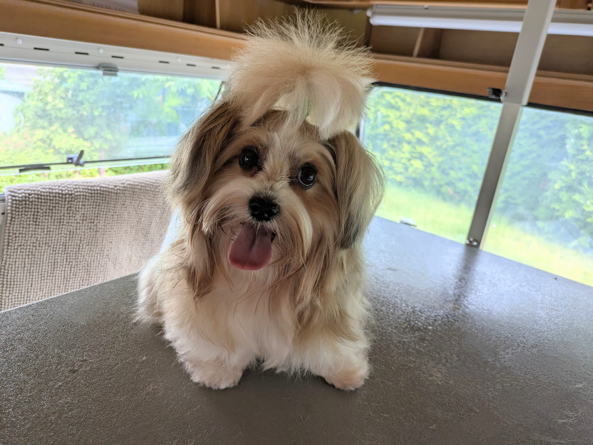 Merlin erhielt in Ronnys Pflegehütte eine komplette Pflege mit Baden, Föhnen und gründlichem Bürsten. Es wurde nur eine dezente Fasson geschnitten, um die Grundlänge seines schönen Fells zu erhalten – dank der guten Bürstpflege von Frauli kein Problem! Statt die Augen freizuschneiden, trägt Merlin seinen typischen Zopf, der natürlich wieder frisch gemacht wurde.